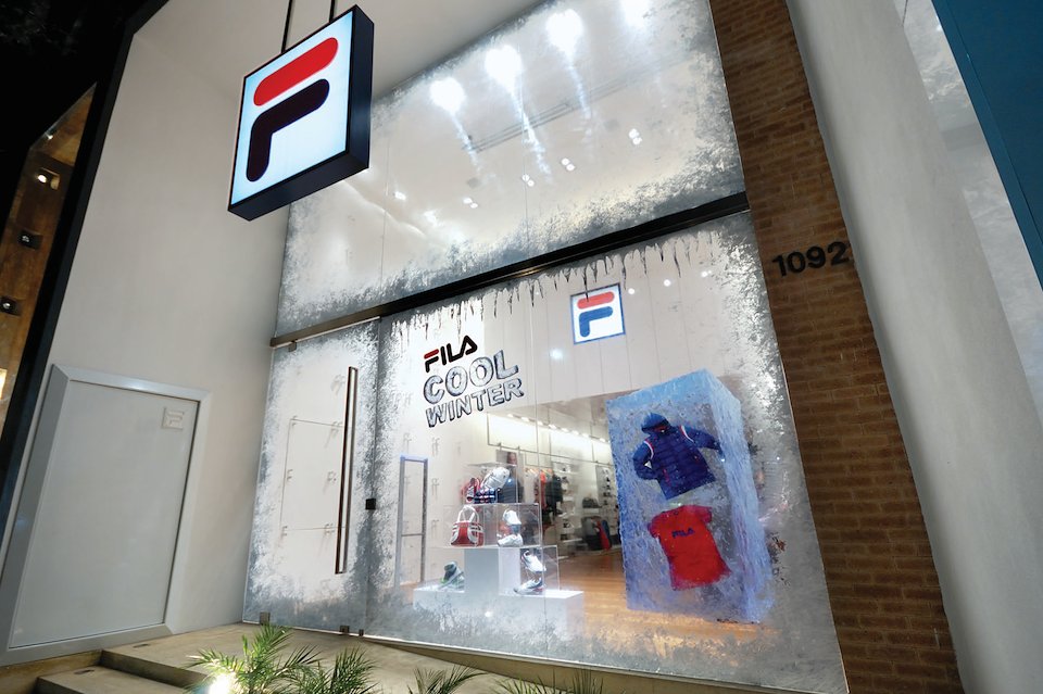 Para lançar a coleção de inverno 2012, a Fila adotou um visual super gelado para a sua vitrine, na Loja Conceito da Oscar Freire. Quem vê, tem a sensação de que uma forte onda de frio passou, congelando o local. As peças da nova coleção foram posicionadas dentro de painéis de acrílico, como se estivessem dentro de blocos de gelo, o que deixa tudo ainda mais divertido. O cenário também é composto por cubos de acrílico, que lembram gelo, onde outros produtos são expostos. Ilustrações hiperrealistas e materiais transparentes trazem mais realidade para o espaço.