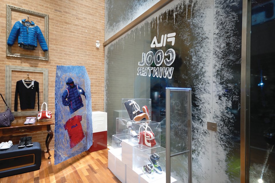 Para lançar a coleção de inverno 2012, a Fila adotou um visual super gelado para a sua vitrine, na Loja Conceito da Oscar Freire. Quem vê, tem a sensação de que uma forte onda de frio passou, congelando o local. As peças da nova coleção foram posicionadas dentro de painéis de acrílico, como se estivessem dentro de blocos de gelo, o que deixa tudo ainda mais divertido. O cenário também é composto por cubos de acrílico, que lembram gelo, onde outros produtos são expostos. Ilustrações hiperrealistas e materiais transparentes trazem mais realidade para o espaço.